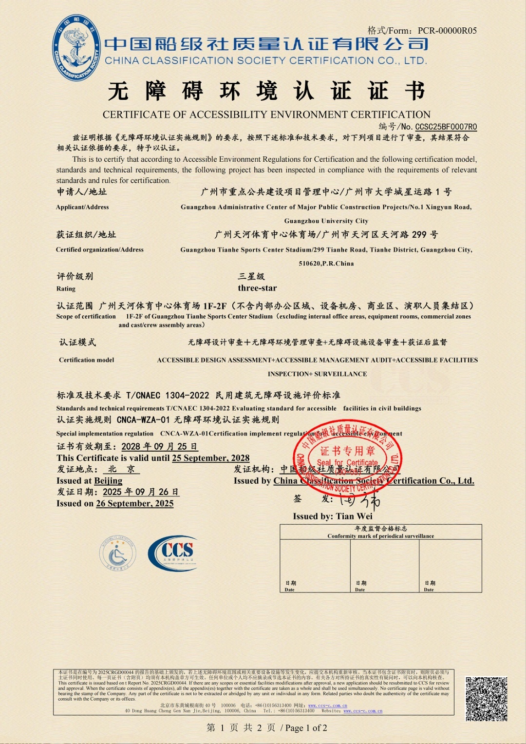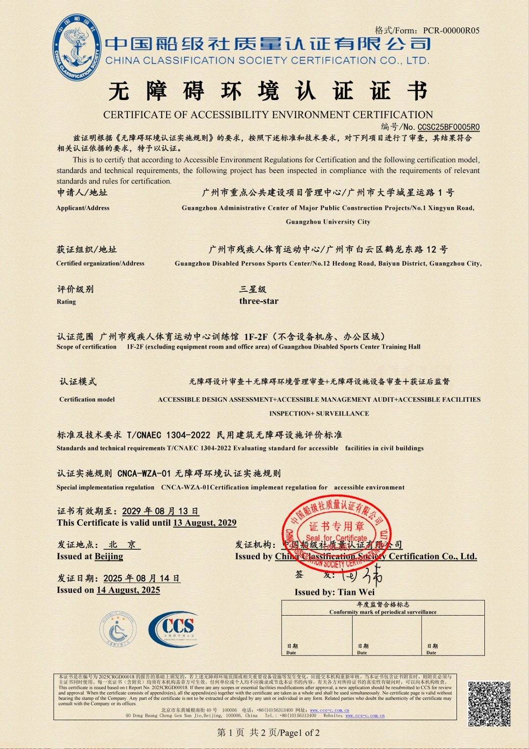 ▲天河体育中心体育场、广州市残疾人体育运动中心三星级无障碍环境认证证书
